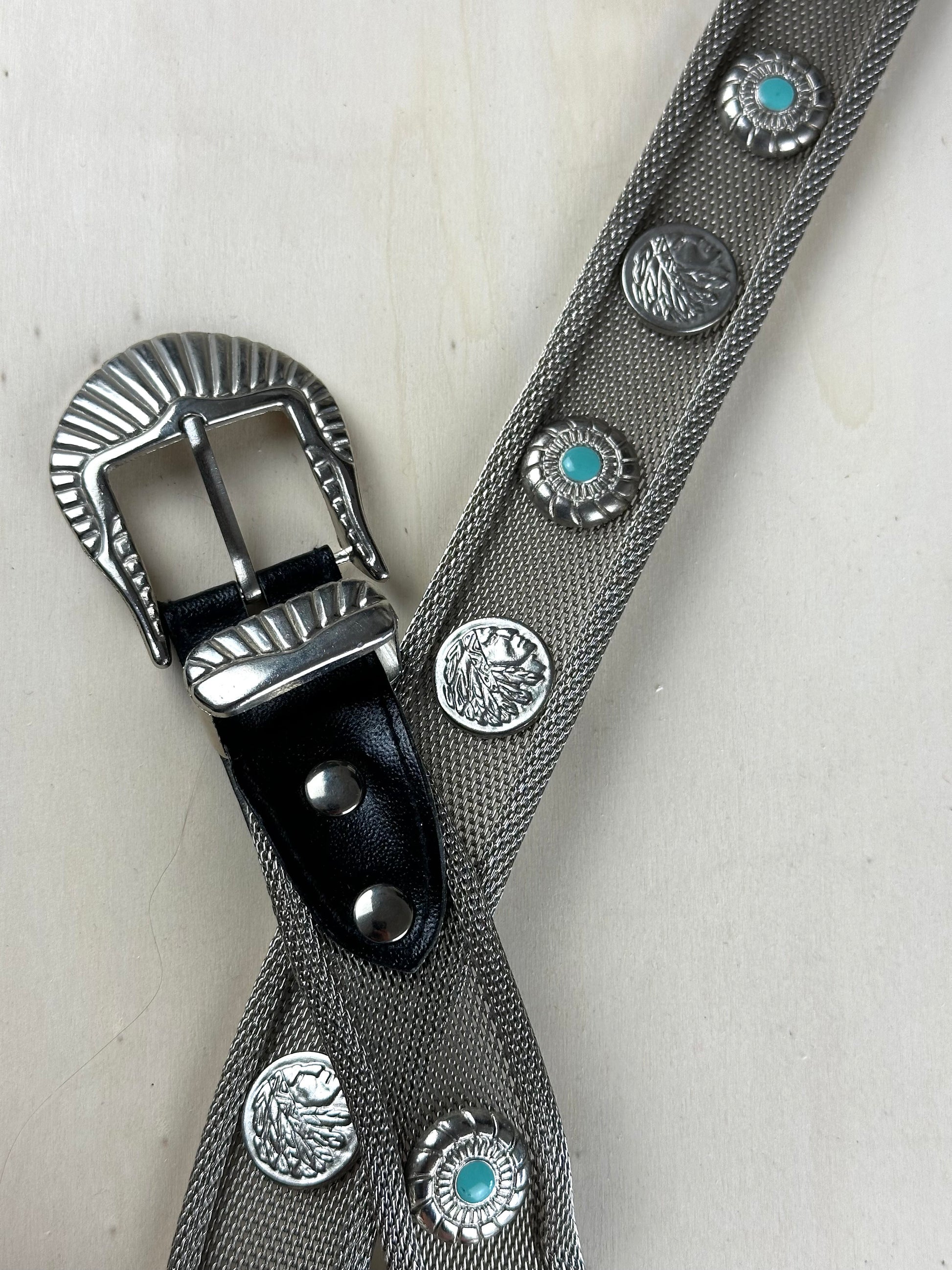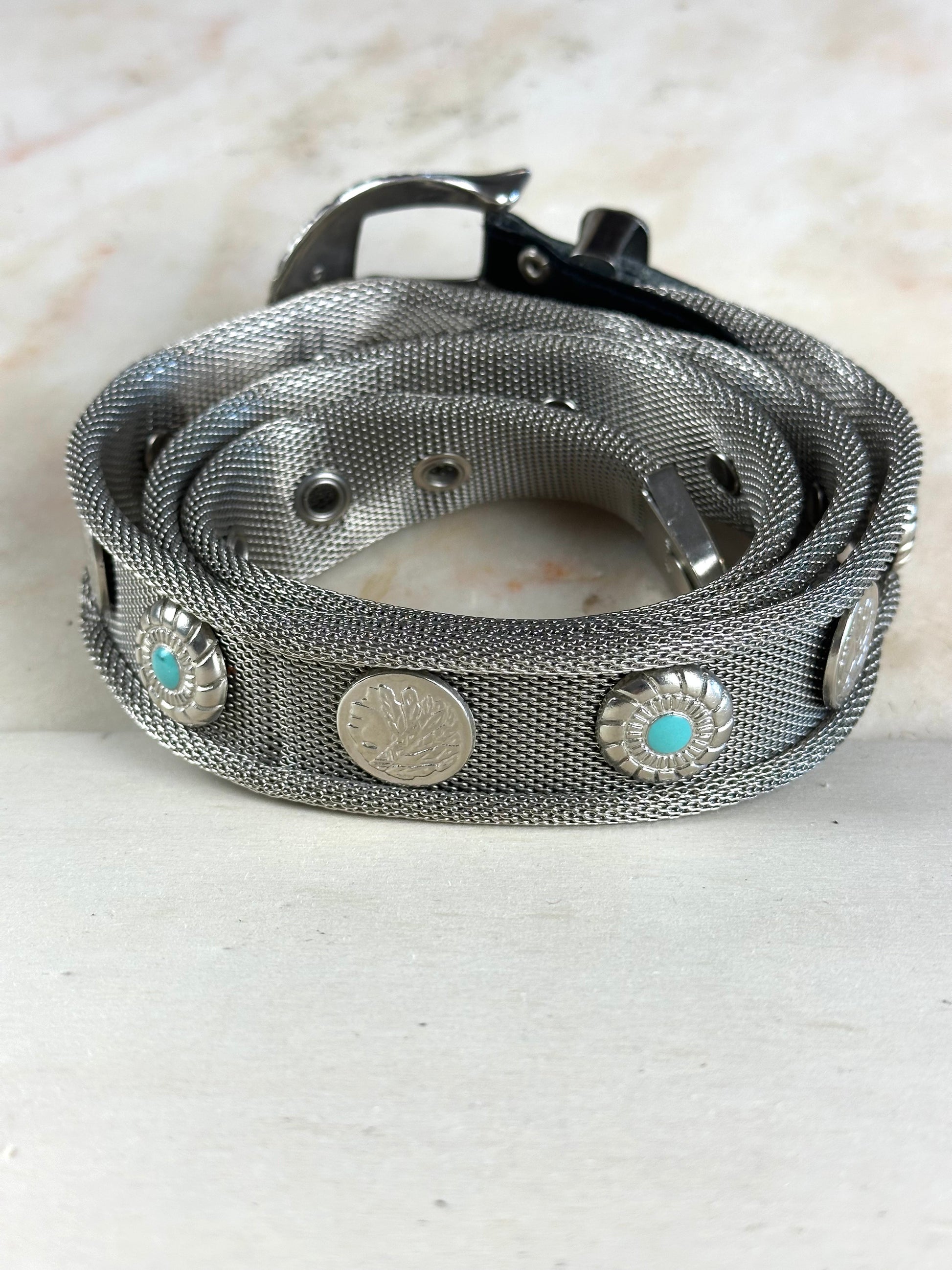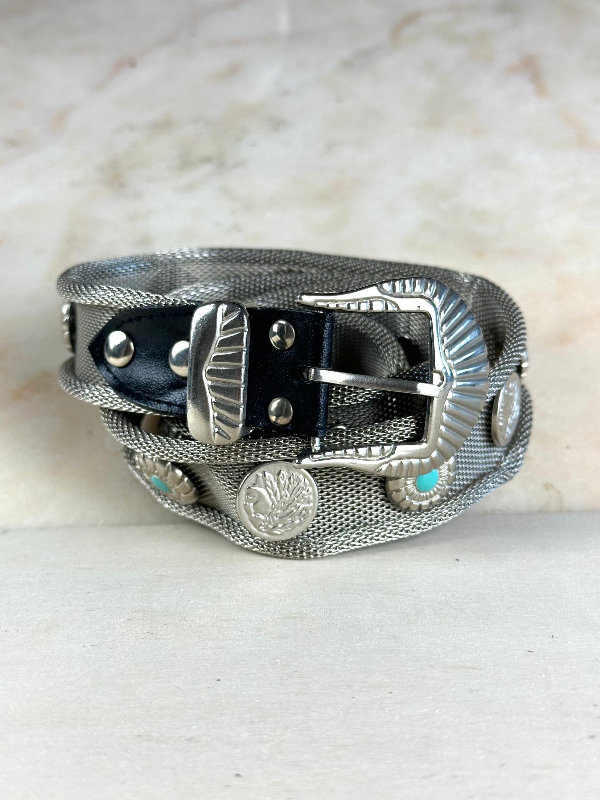 Cintura in maglia metallica e pelle, decorazione con monete e pietre azzurre, 95cm