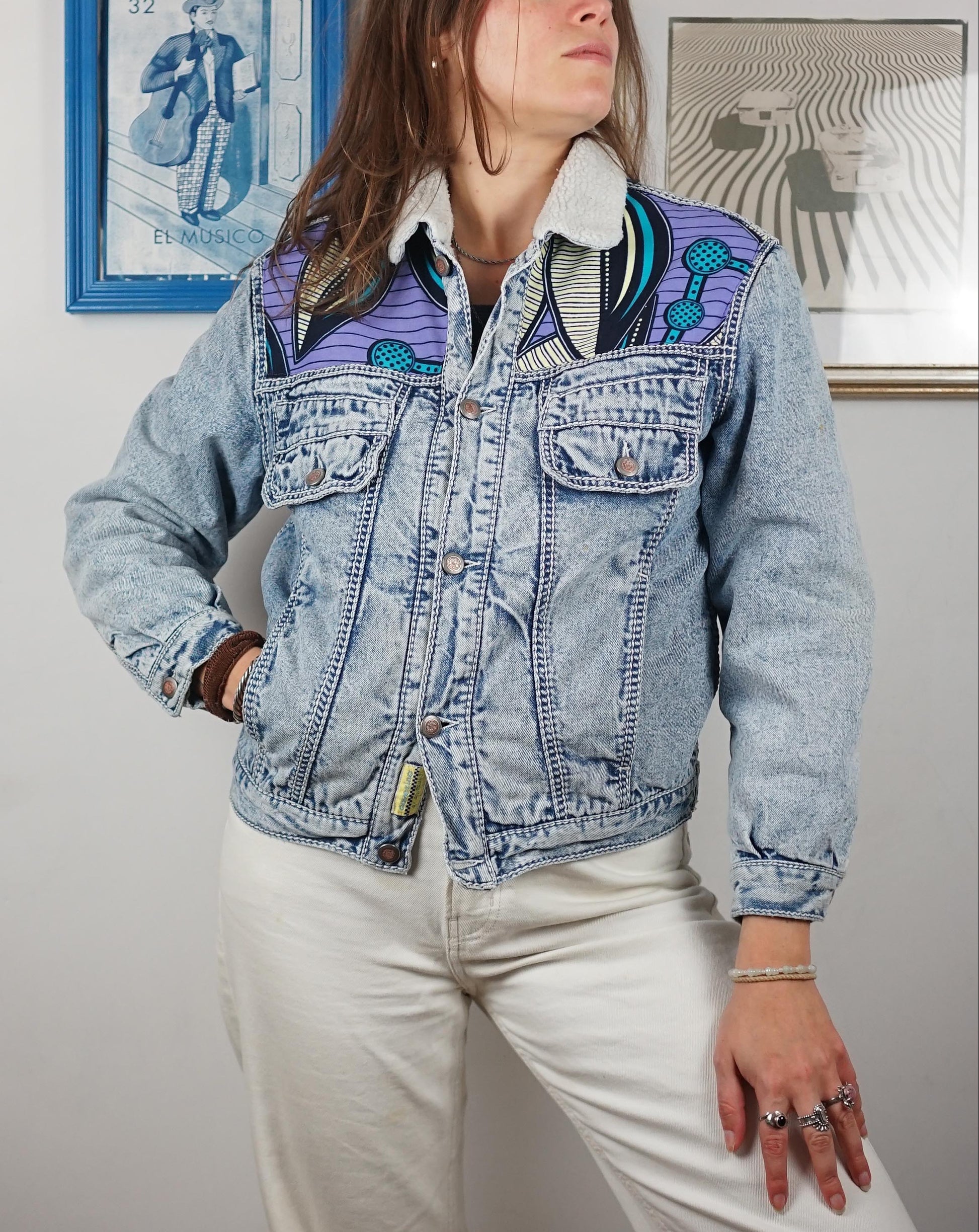 This fabric carries a nomadic, contemporary mood, transforming denim into a narrative surface.
