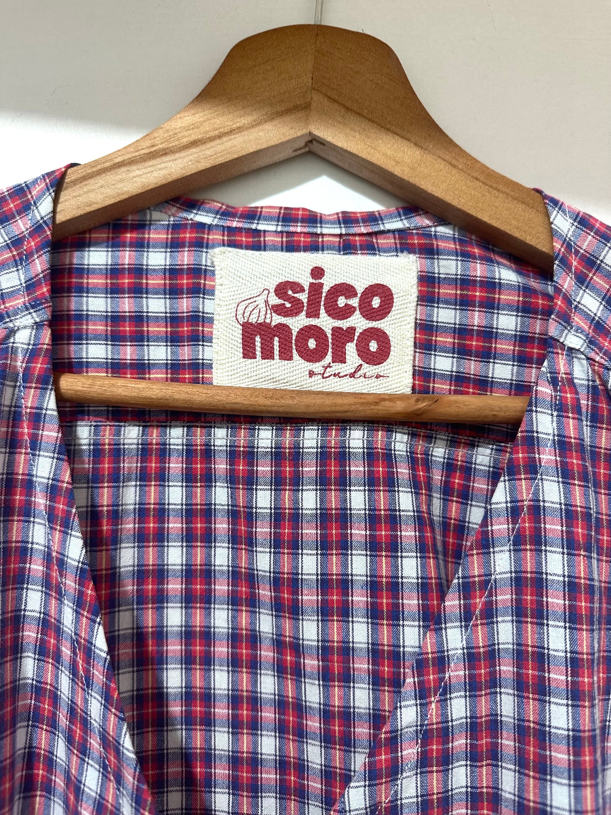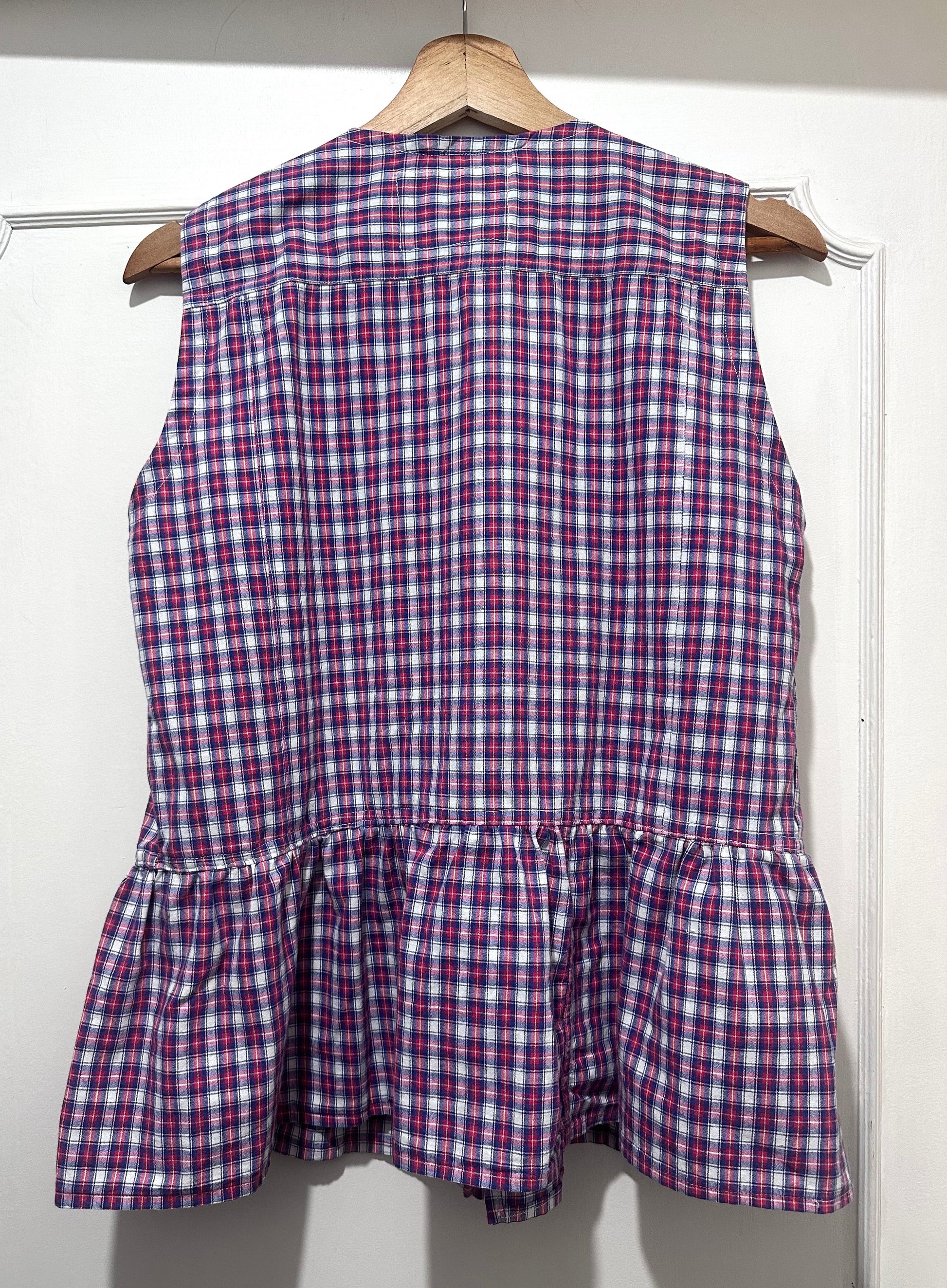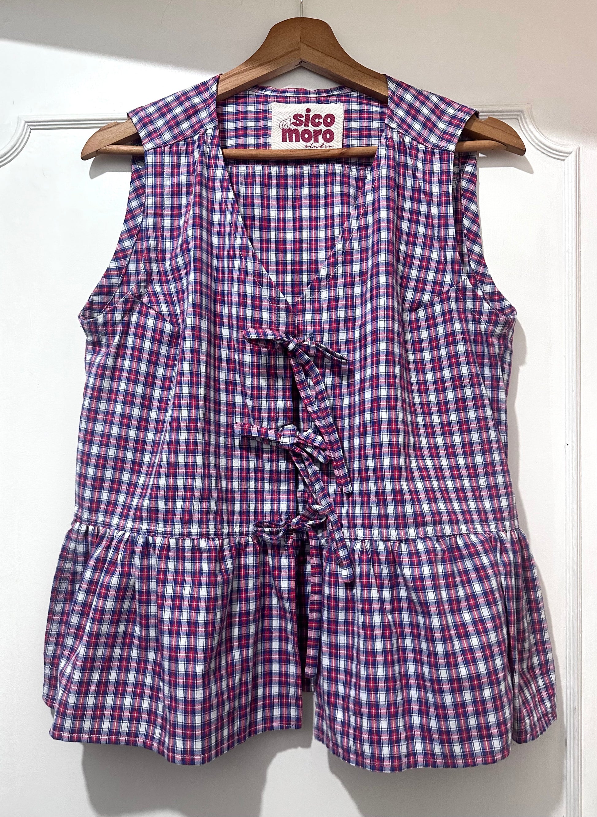 Camicetta senza maniche in cotone upcycled a quadri con laccetti sul davanti e volant. Interamente fatto a mano in Italia.