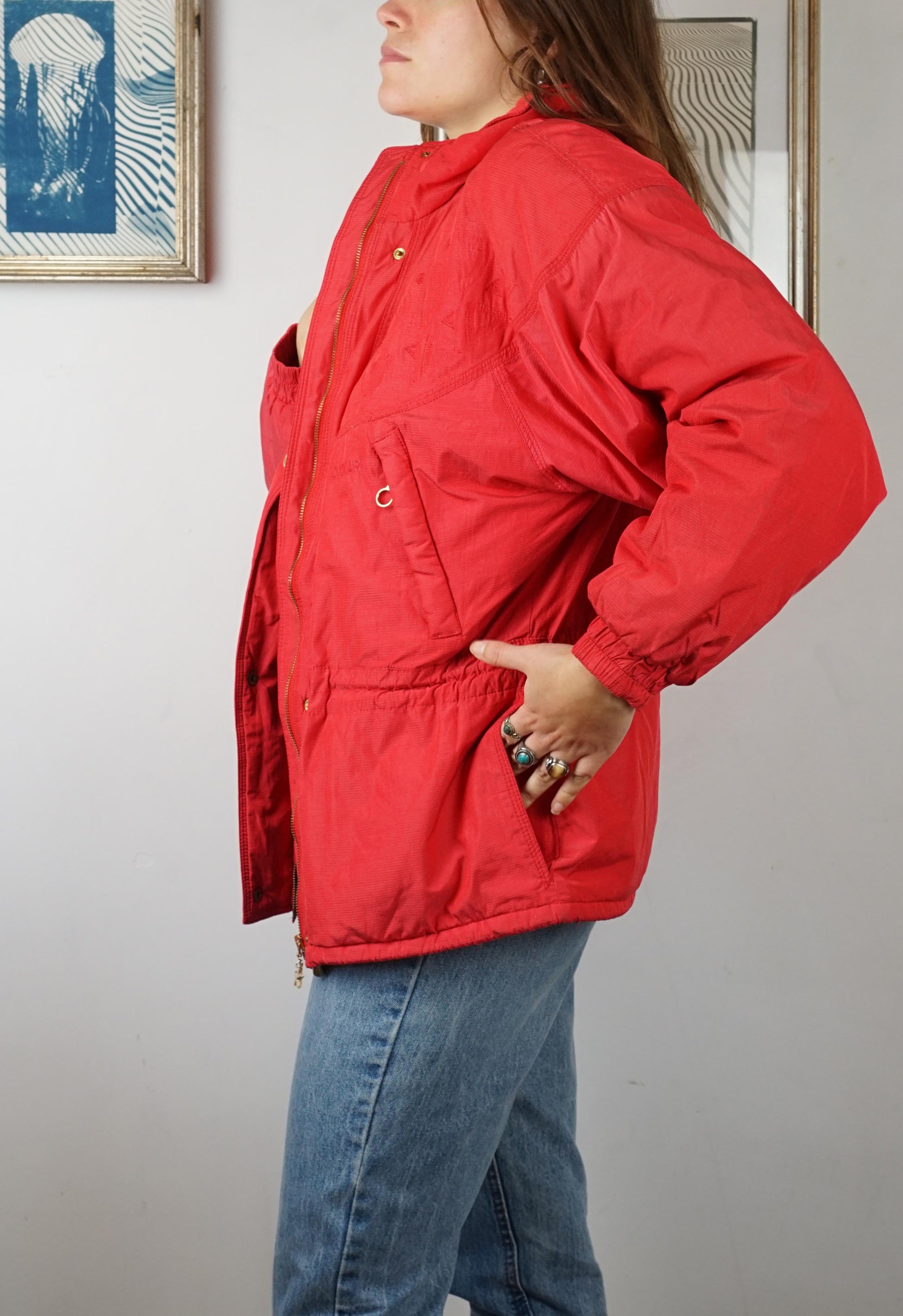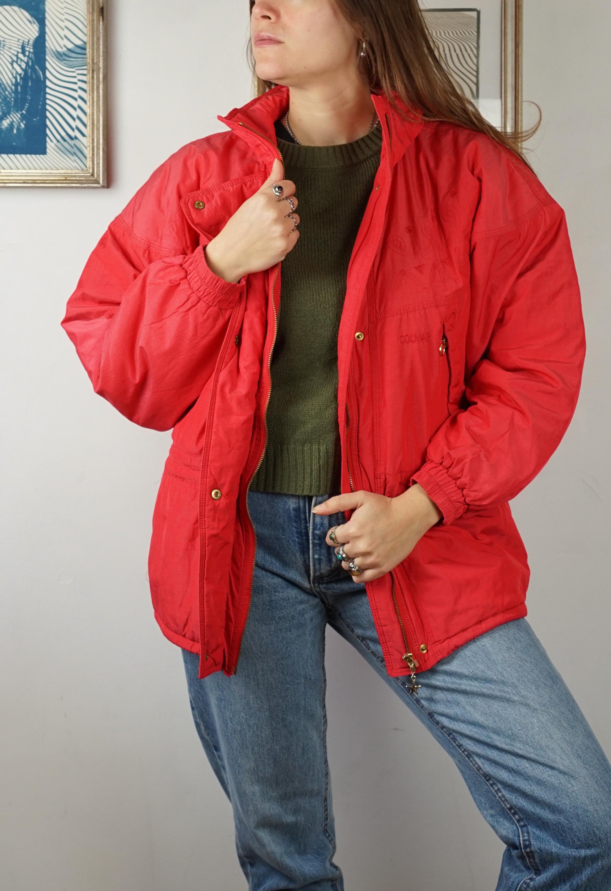 Colmar vintage crop ski jacket, ricamata sul davanti e sul dietro, colore rosso corallo.